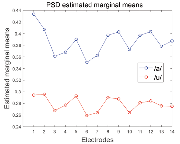 With regard to intra-subject contrast tests for the vowel variable /a/ - /u/, the data show that the average PSD values for vowel /a/ (M = 0.39) differ from the average PSD va-lues for vowel /u/ (M = 0.277). This contrast is significant (F (1,48) = 11.27, p = 0.002, η2 = 0.190). Also, the Electrode variable shows significant differences (F (2.16,103.43) = 4.74, p = 0.009, η2 = 0.090). For the Electrode variable, there are significant differences in the following contrasts: The first contrast (Level 2 vs. Level 3) is the average of the PSDs generated in electrode E2 (M = 0.35) with the PSD of electrode E3 (M = 0.32). This contrast is significant (F (1,48) = 13.92, p = 0.001, η2 = 0.225). The second contrast (Level 4 vs. Level 5) shows an average PSD from electrode E4 (M = 0.32) with the PSD of electrode E5 (M = 0.34). This contrast was also significant (F (1,48) = 8.22, p =0.006, η2 = 0.146). The third contrast (Level 5 vs. Level 6) indicates an average PSD from electrode E5 (M = 0.34) with the PSD of electrode E6 (M = 0.31).
