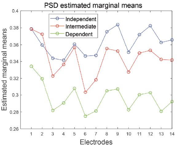 Regarding the test of inter-subject effects, the data show that there are no significant differences in silent speech using vowels /a/ - /u/, in the PSDs generated from the different electrodes due to the subjects’ cognitive styles (F (2,48) = 0.75, p = 0.477, η2 = 0.030) (Figure 7).