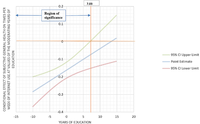 Years of education was a significant moderator in the relationship between subjective general health and times per week of IU (β = 0.012, t = 3.063, p = 0.002). The negative relationship between subjective general health and “Internet use, how often, in times a week” was stronger when the years of education was lower (β = -0.236, t = -7.645, p < 0.001) (Figure 1). The Johnson-Neyman technique (Johnson & Fay, 1950) showed that the relationship between subjective general health and “Internet use, how often, in times a week” was significant when years of education was less than 7.03 standard deviations below the mean, but not significant with higher values.