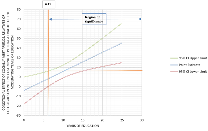 It was expected that (H3) education would moderate the relationship between the perception of social life and the “Internet use, how much time on a typical day, in minutes”. H3 was confirmed since the relationship between “How often do you socially meet with friends, relatives or colleagues”, and “Internet use, how much time on a typical day, in minutes” was significant when years of education was more than 6.11 standard deviations above the mean, but not significant with lower values. These results concur with those found by Lam et al. (2020), who reported that using the Internet for communication was associated with lower depression and better life satisfaction. Amichai-Hamburger and Hayat (2011) also concluded that IU is a predictor of social life and social interactions, increasing the latter.