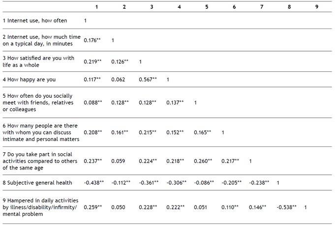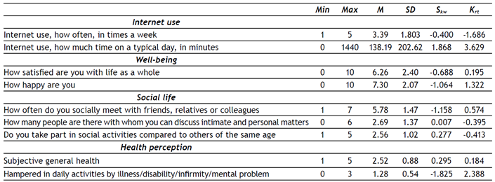 The variable “Internet use, how often, in times a week” correlates positively and significantly with all variables (correlates negatively only with subjective general health), and the highest correlation is with subjective general health. The variable “Internet use, how much time on a typical day, in minutes” correlates significantly with five (three positively and two negatively) of the variables (“how satisfied are you with life as a whole”; “how often do you socially meet with friends, relatives or colleagues”; “how many people are there with whom you can discuss intimate and personal matters”; and “subjective general health”), with the highest correlation, although weak, with “how often do you socially meet with friends, relatives or colleagues” (Table 3).