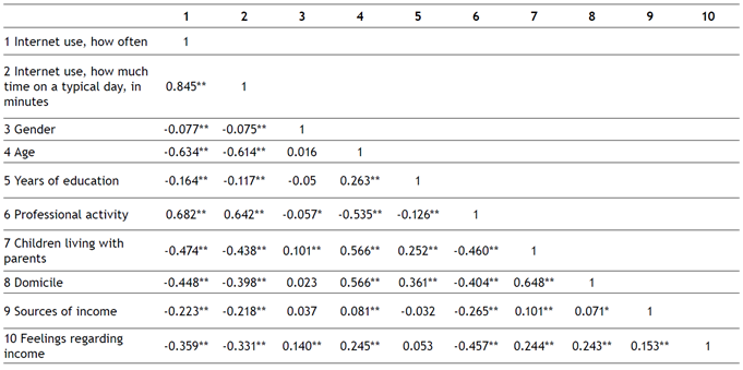 The variables correlate significantly and negatively (except with professional activity) with all sociodemographic variables, although the highest correlations occur between age and professional activity, on one hand, and “Internet use, how often, in times a week” on the other; and between professional activity and “Internet use, how much time on a typical day, in minutes” (Table 2).