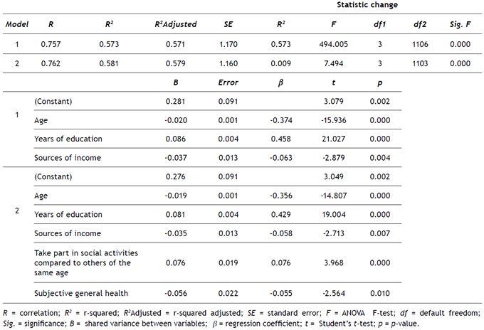 Resultados: Idade, escolaridade, fontes de renda familiar, atividades sociais em comparação com outras da mesma idade e saúde geral subjetiva explicam IU por dia e idade, anos de escolaridade, domicílio, convívio social com outras pessoas e quem para discutir assuntos íntimos explicam IU por semana. A escolaridade mostrou-se um moderador significativo na relação entre saúde geral subjetiva e IU por semana; e na relação entre encontro social com outras pessoas e IU por dia.
