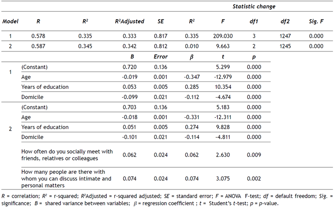Regarding the “Internet use, how much time on a typical day, in minutes”, variable a significant model was found that explains 34% of the variance of this variable (F(5, 1245) = 131.026; p < 0.001; R2 = 0.345). Sociodemographic and other variables contributing to explain this variance are age, years of education, domicile, “how often do you socially meet with friends, relatives or colleagues” and “how many people are there with whom you can discuss intimate and personal matters” (Table 5). Being younger, having less education, living in larger cities, acting socially with more people and having more people with whom to confide, taken together, account for 34% of the time variance (in minutes) of daily IU.