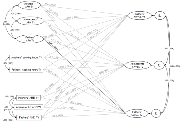 In addition to the five hypotheses posed, this study explored longitudinal interrelations between these variables and between mothers, fathers, and adolescents. Two exploratory research questions (ERQ) were also proposed to examine the effects of food habits (perceived family meal atmosphere and diet quality, and parents’ cooking hours) measured at T1 on SWFoL measured at T2. The first ERQ probed intra-individual effects from the three family members’ food habits at T1 to their own SWFoL at T2. The second ERQ tested these same relations between family members (inter-individual effects).