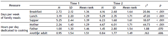 Resultados: La frecuencia de las comidas familiares y las horas que la madre dedicó diariamente a cocinar aumentaron durante la pandemia. Los tres miembros de la familia mejoraron la calidad de su dieta durante la pandemia. La atmósfera percibida de comidas familiares y la satisfacción con la alimentación no cambiaron. Los hábitos alimentarios del T1 no incidieron en la satisfacción con la alimentación en T2.