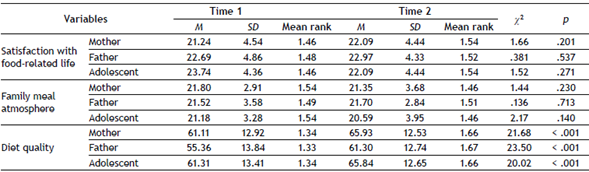 Method: A sample of 193 families composed of mother, father, and one adolescent aged 10 to 15 responded to a questionnaire at T1 and T2. Non-parametric tests were used to compare family food-related habits and the satisfaction with food-related life of each family member at T1 and T2. An Actor-Partner Interdependence Model was conducted to explore relations between T1 and T2 variables and between family members.