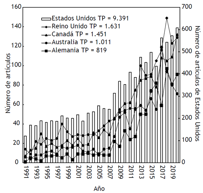 El análisis de los países con 100 artículos o más, permitió identificar 22 países en orden decreciente de publicaciones: Estados Unidos (n = 9391), Reino Unido, (n = 1631), Canadá (n = 1451), Australia (n = 1011), Alemania (n = 819), Países Bajos (n = 489), China (n = 312), España (n = 308), Israel (n = 291), Turquía (n = 248), Francia (n = 225), Japón (n = 220), Brasil (n = 219), Suecia (n = 216), Sudáfrica (n = 210), Suiza (n = 203), Italia (n = 198), Nueva Zelanda (n = 191), Corea del Sur (n = 167), Noruega (n = 166), Irlanda (n = 114) y Finlandia (n = 105). En su conjunto, los países que han publicado sobre maltrato infantil abarcan los cinco continentes; sin embargo, se aprecia una marcada concentración de artículos provenientes de América del Norte (n = 10 842, 65.5 % del total de artículos con afiliaciones declaradas), contrastando con lo observado en África y América Latina, con 1.3 % y 1.2 %, respectivamente, del total de artículos con afiliaciones declaradas. La evolución del volumen de publicaciones de los cinco países más productivos (Figura 1), presenta una tendencia ascendente que se acentúa en el último decenio estudiado.