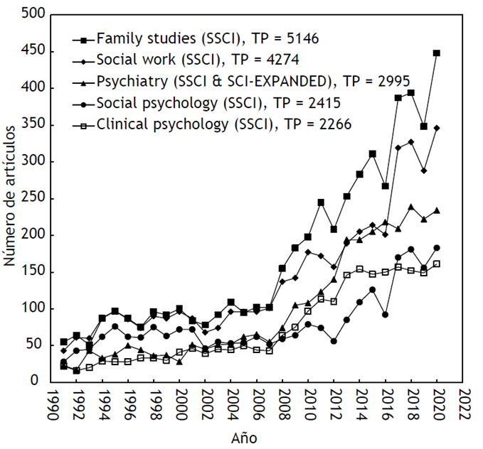 La Tabla 2 muestra las diez principales categorías de WoS que concentran los artículos publicados. Dado que las revistas pueden clasificarse en más de una categoría en SSCI y SCI-Expanded, el porcentaje acumulado supera el 100 % en la Tabla 2. Es posible observar que la mayoría de las revistas corresponden a la categoría de estudios sobre la familia (47 revistas en la categoría en SSCI), con 5146 artículos (31 % de 16 701 artículos en revistas con información de la categoría en SSCI y SCI-Expanded), seguida de trabajo social (44 revistas en SSCI), con 4274 artículos (26 %). Comparando las diez primeras categorías, los artículos publicados en la categoría de psicología del desarrollo tuvieron el mayor CPP2020, 37. Los artículos publicados en la categoría de psiquiatría tuvieron el mayor CPP2020, 5.2. Las cinco principales categorías productivas agrupan 8476 artículos (51 % de 16 701 artículos) con un CPP2020 de 28. La Figura 2 muestra las tendencias de desarrollo e interacciones de las cinco principales categorías de la WoS. Estas pertenecen mayoritariamente a SSCI y exhiben un aumento transversal en el TP a lo largo del tiempo, evidenciando la relevancia de los aspectos sociales, culturales y comportamentales en la investigación sobre maltrato infantil.