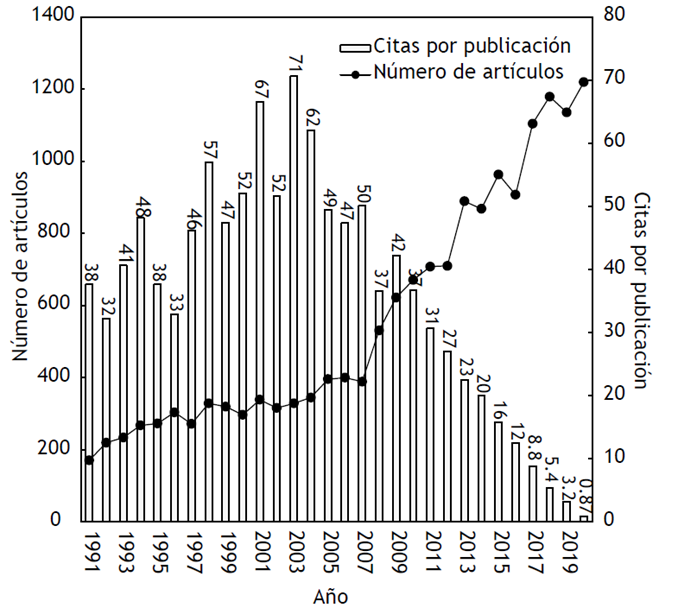 El número total de citas en la Colección Principal de WoS y en la de Web of Science desde el año de publicación hasta finales del 2020, suma 455 712; mientras que el número de citas por publicación durante el 2020, alcanza las 27. Aquellos artículos escritos en inglés tuvieron más citas que los escritos en otros idiomas, con un CPP2020 de 28 y CPP2020 de 5.3, respectivamente.