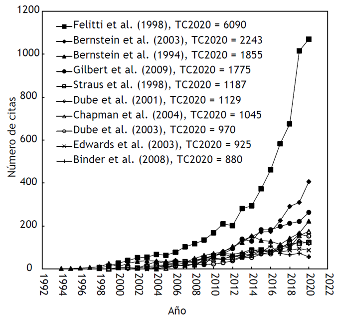 En el caso de los artículos sobre maltrato infantil, el 50 % de los 100 más citados en el 2020, estaba también entre los 100 artículos más citados de todo el periodo estudiado. El título proporciona detalles razonables sobre el tema del artículo (Wang et al., 2010); mientras que las palabras clave de autor (KWA) etiquetan la investigación principal, en la que se centran los artículos. Por ello, la Tabla 4 muestra los diez artículos más citados con términos de búsqueda en su título o KWA (Ho & Mukul, 2021) con TC2020 y C2020; mientras que la Figura 4 presenta sus historiales de citación. Como se puede apreciar, la mitad de los artículos investigan el maltrato infantil como parte de las Experiencias Adversas en la Infancia; mientras que la evaluación y el impacto del maltrato infantil también son temas de interés. La totalidad de estos artículos son publicaciones relativamente recientes, que corresponden a los dos primeros periodos en estudio (1991-2000 y 2001-2010).
