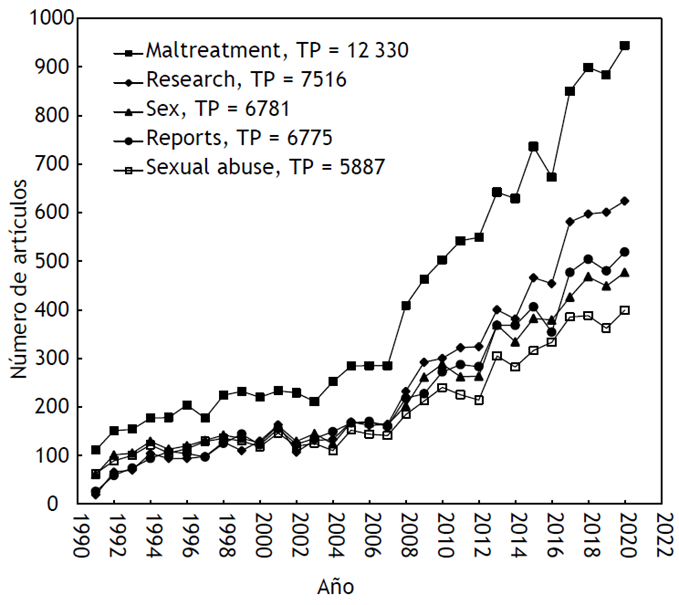 A lo largo del periodo analizado (1991-2020), los tres principales focos en la investigación del maltrato infantil han sido maltrato, investigación y sexo (Figura 5). Todos exhiben un progresivo aumento en el número bianual de artículos publicados. El estudio del maltrato lidera entre los tópicos y es el único cuya tendencia ascendente se incrementa desde el 2008. Este foco revela el interés por comprender el maltrato como fenómeno que puede afectar a personas de todas las edades, en el contexto de relaciones marcadas por acciones u omisiones que redundan en el perjuicio de la víctima. En segundo lugar, la investigación es referida como una categoría fundamental para el desarrollo científico de la temática, pudiendo comprobar, profundizar o trascender la teoría al descubrir agrupaciones ocultas entre los datos. Por último, sexo remite a un constructo biológico de particular relevancia al indagar las implicancias neurobiológicas del maltrato infantil. Otros focos de interés son reportes, destacando la aplicabilidad de los datos de investigación, y abuso sexual, que entrelaza el maltrato con la sexología y criminología.