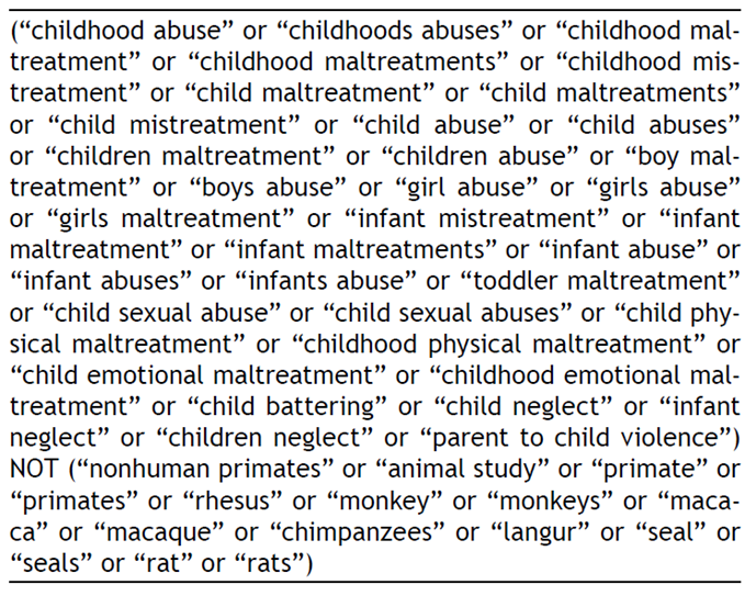 La cadena de búsqueda empleada para la recolección de datos (Tabla 1) fue construida sobre la base de un proceso iterativo que integró los términos utilizados en estudios anteriores (Behl et al., 2003; Tran et al., 2018) y la revisión de la primera página de los documentos para asegurar su pertinencia, según los planteamientos de Ho et al. (2022). Se utilizaron comillas y los operadores booleanos or y not al realizar la búsqueda de artículos por tema, incluyendo el título, el resumen, las palabras clave del autor (KWA) y KeyWords Plus. Estas últimas proveen términos de búsqueda adicionales extraídos de los títulos de los artículos citados por los autores, aumentando sustancialmente la indexación por palabras de título y de autor (Garfield, 1990). Primero, se combinó la población de estudio en plural y singular; y el tipo de maltrato, o subtipo de maltrato sufrido. En segundo lugar, se excluyeron los términos tras analizar manualmente los documentos. Por último, se delimitó el análisis a los 30 años recientes (1991-2020), resguardando que el Journal Citation Report (JCR) ofreciera el Factor de Impacto de las revistas del 2020 (IF2020), en la fecha de descarga (Ho et al., 2022).