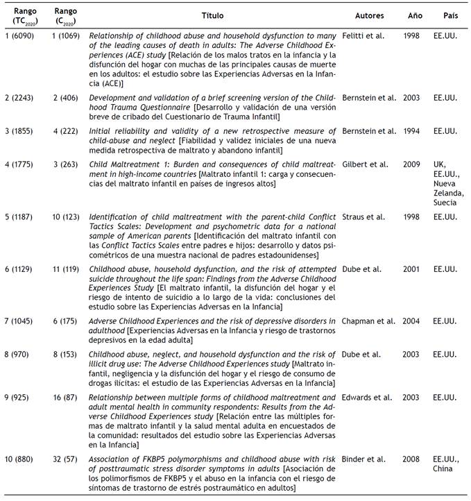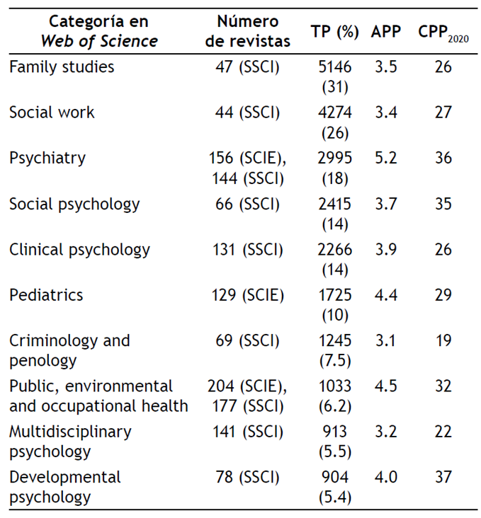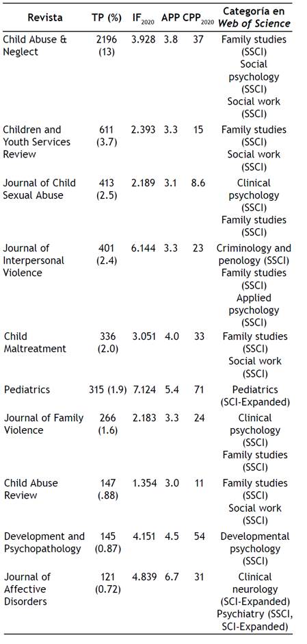 En total, 1962 revistas en SSCI y SCI-Expanded publicaron artículos sobre maltrato infantil. La Tabla 3 muestra las diez revistas más productivas. La revista Child Abuse & Neglect (IF2020 = 3928) es la que más publicó, con 2196 artículos (13 % de los artículos), seguida de lejos por otras revistas. Si se comparan las diez revistas más productivas, los artículos sobre maltrato infantil publicados en Pediatrics (IF2020 = 7124) tuvieron el CPP2020 más alto, de 71. Las revistas con el IF2020 más alto ocuparon los tres primeros puestos en la categoría de medicina general e interna de WoS; pero no forman parte de las revistas que concentran más artículos: New England Journal of Medicine (n = 1, IF2020 = 91 245); Lancet (n = 12, IF2020 = 79 321) y JAMA-Journal of the American Medical Association (n = 19, IF2020 = 56 272).