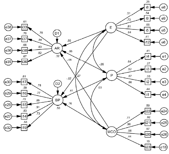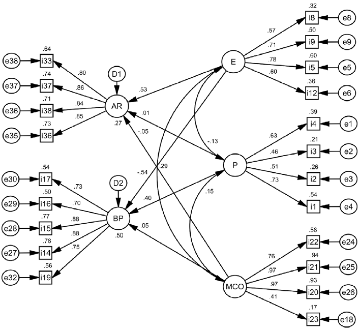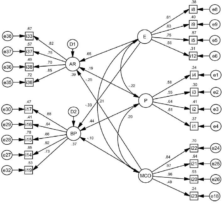 Escala de Agresividad (Bouquet-Escobedo et al., 2019). Comprende cinco factores que son: (1) reactividad (nueve ítems), (2) rencor (cuatro ítems), (3) procesamiento cognoscitivo negativo (cinco ítems, (4) frustración (cuatro ítems) y (5) insatisfacción con la pareja (tres ítems). Se contesta con un recorrido de seis alternativas de respuesta, desde 6 (Totalmente de acuerdo) hasta 1 (Totalmente en desacuerdo). Para los propósitos de este estudio, solo se usó la subescala de reactividad, la cual será llamada aquí “agresión reactiva”. Cuando esta subescala de agresión reactiva se sometió nuevamente al análisis factorial confirmatorio con los datos recabados en los cuatro países del estudio presente, se redujo a los siguientes cuatro ítems que tuvieron las cargas factoriales más altas: i33 “Golpeo si me golpean”, i36 “Soy agresivo(a) si me provocan”, i37 “Cuando alguien me agrede, lo agredo” e i38 “Soy violento(a) cuando la gente lo merece”.