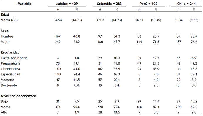 Participaron 1138 personas de México, Colombia, Perú y Chile, 759 mujeres y 379 hombres. La amplia mayoría de los participantes del estudio tenían cuando menos 18 años (96.75 %) y tan solo 37 personas estuvieron en el rango de edad de 16 y 17 años (3.25 %). En la Tabla 1 se indican las características sociodemográficas de los participantes por país.