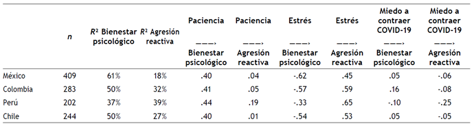 La evidencia recabada apoya la hipótesis en el caso del bienestar psicológico, el tamaño del efecto de las varianzas explicadas fue grande en los cuatro países. En el caso de la agresión reactiva, también se halló un tamaño del efecto grande para las varianzas explicadas en Colombia, Chile y Perú, pero no en el caso de México, donde fue mediano. Estos hallazgos pueden interpretarse en el sentido de que las variables independientes paciencia, estrés y miedo a contraer COVID-19 del modelo estructural usado permiten explicar de manera similar tanto el bienestar psicológico, como de la agresión reactiva en los cuatro países latinoamericanos, aunque las muestras no eran probabilísticas y presentaban diferencias en edad y escolaridad, cuando menos.