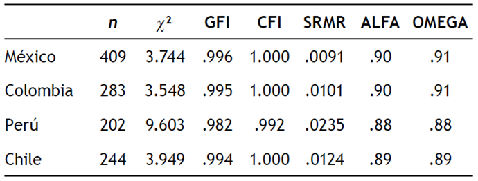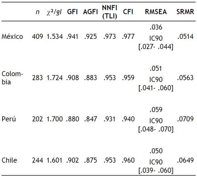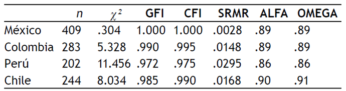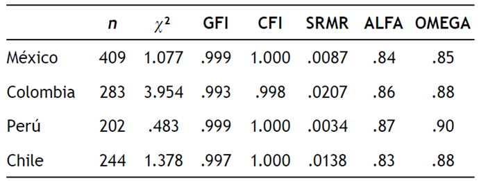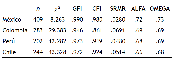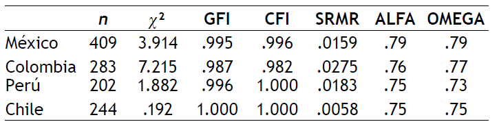 En las Tablas 3, 4, 5, 6y la 7 se resumen los indicadores de bondad de ajuste resultantes del análisis factorial confirmatorio y los coeficientes de consistencia interna para cada escala del estudio, en los cuatro países.