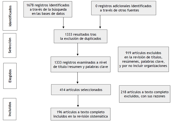 Como lo evidencia la Figura 1, se unificaron los artículos de cada una de las bases con los criterios de selección, para un total de 1678 artículos; se descartaron los artículos duplicados, para un total de 1333 artículos. Con la lectura rigurosa de títulos, resúmenes y palabras clave para reunir todos los estudios que contuvieran los términos de búsqueda, se seleccionaron 414 artículos. Finalmente, se hizo lectura de textos completos verificando los criterios de inclusión y exclusión, se tomaron 196 artículos.