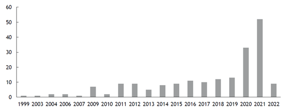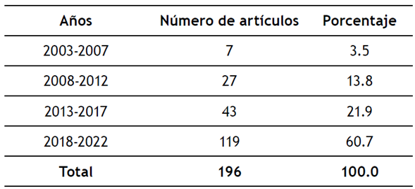 En la Tabla 2 se observa que el periodo comprendido entre 2018-2022, corresponde al mayor número de artículos publicados y revisados (119), seguido por 2013-2017 (43), luego 2008-2012 (23) y el surgimiento del estudio de la SP, entre 2003-2007, con 7 artículos.