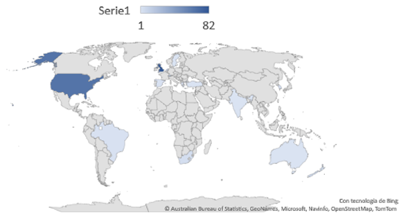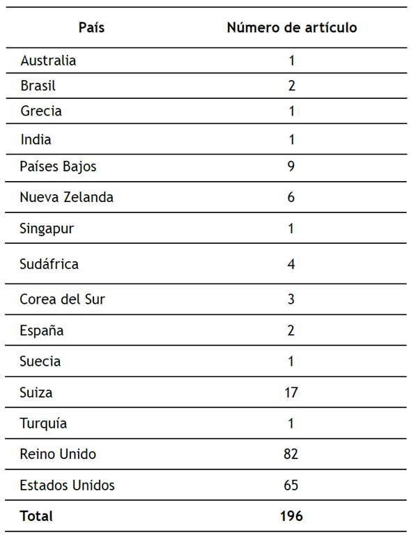 La información analizada de los 196 artículos empíricos evidencia que en los últimos cinco años y alrededor de la pandemia por el COVID-19, se presenta un incremento significativo del interés por el estudio sobre la SP (Figura 2). Las revistas donde se publican los estudios provienen prioritariamente de países como Reino Unido (82), Estados Unidos (65), Suiza (17), Países Bajos (9), Nueva Zelanda (6) y otros. Ello muestra la escasez de trabajos publicados en revistas de Iberoamérica, ya que solo se encontraron dos artículos en Brasil y dos en España (Tabla 1 y Figura 3).