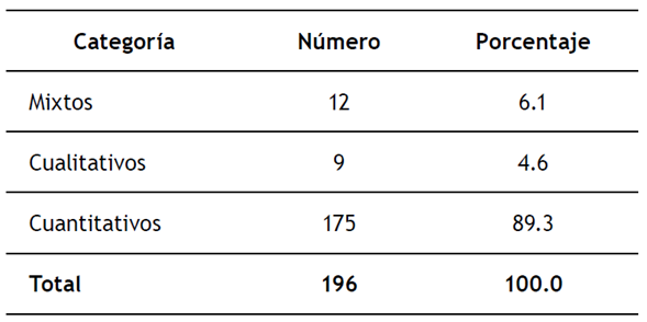 En la Tabla 3 se observa que la mayoría de los estudios se han realizado con metodologías cuantitativas con el 89.3 % que equivale a 175 artículos.