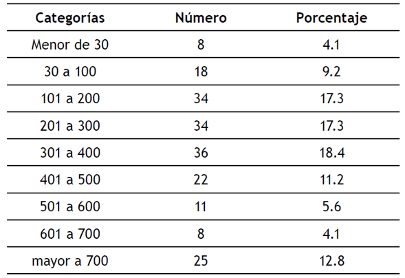 En la Tabla 4 se observa que el tamaño de la muestra más frecuente en 36 estudios fue de 301 a 400 participantes, seguido de 101 a 200 y de 201 a 300, ambas muestras utilizadas en 34 estudios.