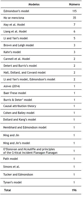 En la sistematización de los modelos citados en los artículos revisados, se observa en la Tabla 5 que el modelo teórico más usado es el de Amy Edmondson, con una frecuencia de 115 veces; y que la mayoría de los autores usan un modelo particular, asociado al de Edmondson.