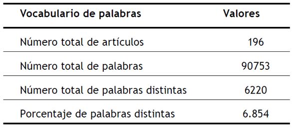 El tratamiento de los datos comienza con la segmentación del corpus en palabras (Bécue-Bertaut, 2010). En la Tabla 6, los datos dan información relevante sobre la longitud y el vocabulario del corpus que, como se dijo anteriormente, estuvo conformado por título, resumen, palabras clave, definición de SP, modelos teóricos, variables psicológicas asociadas, metodologías, participantes, muestras, instrumentos y conclusiones. El corpus tiene una longitud de 90 753 palabras y estáformado por 6220 palabras distintas.