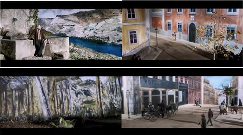 O filme cria mesmo um artefacto, teatral ou operático, para destacar a palavra. Os painéis de João de Queirós da cidade de Lisboa, mas também de Santa Eulália e de Sintra, são um fabuloso detalhe artístico, que confere a todo o filme um ambiente onírico. Além disso, coloca-nos perante um palco, o que permite uma certa teatralidade e nos transporta mais facilmente para a época (HALPERN, 2014, p. 9).