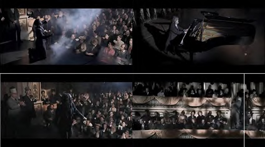Neste sentido, toda a interpretação fílmica destaca a ideia de artificial induzindo à associação com a sociedade retratada. A sucessão de cenas, quase que simulando cenas-quadro, revela uma classe aristocrática inculta e desinteressante. Quer se trate do jantar no Hotel Central, do Sarau no Teatro da Trindade, das Corridas de Cavalos ou do incidente com o jornal A Corneta do Diabo, o que sobressai são os episódios previamente criados por Eça de Queirós para espelhar uma nação atrasada em modo irónico e caricatural. Evidencia-se o exemplo do Sarau no Teatro da Trindade (Imagem 2), cuja assistência inculta e de modos grosseiros caracteriza de ‘sublime’ o discurso de Rufino e ‘extraordinária’ a intervenção de Alencar, ao mesmo tempo em que zomba e vaia o momento erudito de Cruges que toca Beethoven ao piano. De forma rude e a apupar, o auditório pouco culto do Teatro da Trindade levanta-se a abandona a sala aquando da performance clássica do músico, sem saber apreciar a arte e respeitar o artista. E, no entanto, trata-se da alta burguesia lisboeta, o elenco privilegiado do país.