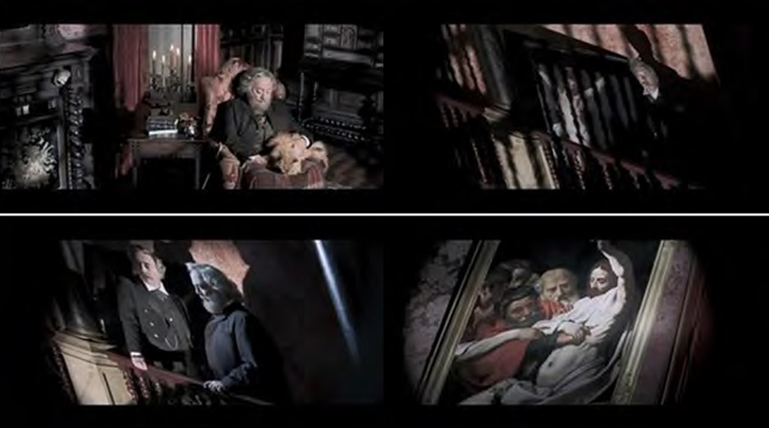 Podemos observar que a cena do filme em que Afonso da Maia sonha é emblemática e reveladora da intencionalidade narrativa e estética do diretor. Esta cena não consta das páginas do romance escrito por Eça de Queirós, mas é uma interpretação livre introduzida aquando do trabalho de adaptação ao cinema que, embora aposte fortemente na intertextualidade, convida a desvios narrativos aliciantes. Para além de introduzir um elemento diegético essencial na história (a procura da neta desaparecida), o modo como a cena é filmada, em contraposição de ângulos picados e contrapicados e ao estilo expressionista, traduz não só a perturbação psicológica do patriarca, como a marca operático-teatral da ficção. Indo para além do visível, a expressividade fílmica, valendo-se da iluminação que produz um contraste acentuado e sombras dramáticas, imiscui-se na fantasia onírica de Afonso. A sombra de Vilaça projeta-se sobre o quadro de Cristo antevendo o papel significativo do procurador da família na revelação da desgraça e o próprio cenário participa do drama sublinhando a queda e a fatalidade. Aliás, no início do sonho de Afonso a pintura de Cristo cai pressagiando um final inevitável ou a anunciação de que não existe perspectiva de mudança. Tanto os cenários, como a iluminação, bem como a música e a sonorização constituem um fator aglutinador para frisar a intencionalidade do cineasta João Botelho. Por outro lado, enfatizando o universo de palco operático-teatral a cena é filmada como se os seres ficcionais assumissem simultaneamente a posição de participantes de uma audiência de espetáculo confortavelmente instalada num camarote de ópera e, ao mesmo tempo, intervenientes ativos de uma peça em palco teatral. A leitura possível dessa cena em particular possibilita descortinar os elementos que o cineasta modela ao longo de todo o filme para fazer sobressair a sua expressão autoral. E, no entanto, trata-se de uma cena curta, colocada a poucos minutos do início do filme, e induzida de uma interpretação pessoal do livro (Imagem 4).