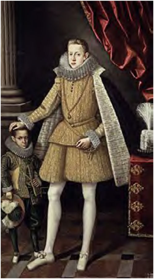 A subserviência dos cães ferozes era demonstrada, como ainda o é, pela mão que repousa sobre a cabeça do animal, como vemos no retrato de Bébé. Mas como a maquinação nunca cessa de operar, frequentemente vemos a mão do patrono apoiar-se sobre a cabeça do anão como faria com seu cão. Em um retrato de 1620, pintado por Rodrigo de Villandrando, o mesmo Felipe IV, ainda príncipe, pode ser visto afagando seu nanico italiano da época, chamado Soplillo (Figura 3). Sabe-se que era bem difundida na Europa a crença que esfregar um anão, em particular na cabeça e na corcunda, trazia sorte e prosperidade. Gostaria de sugerir, no entanto, que a incidência do gesto na pintura decorre antes do funcionamento máquina antropológica – isto é, da confusa contiguidade entre anões e cachorros – que dessa superstição. A crença na natureza afortunada do ato seria, nesse sentido, a racionalização de um impulso, uma explicação a posteriori associada a um gesto maquinal, realizado por automatismo. A superstição que justifica o gesto é o dizível de um funcionamento invisível, a verbalização de um sintoma.