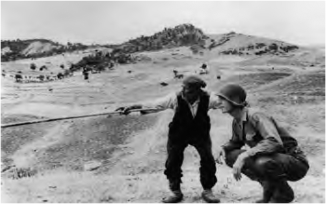 As relações entre anões, cachorros e patronos, tal como ilustradas aqui, correspondem a convenções iconográficas bastante difundidas e fortemente enraizadas como tropos visuais. É fascinante observar como a fotografia pode perpetuá-los, mesmo quando seu sentido imediato é alterado. Tomemos, por exemplo, uma famosa ocorrência do nanico italiano no século XX, agora ao lado de seu protetor-libertador. Trata-se de uma fotografia de Robert Capa, tomada durante a invasão da Sicília pelas forças aliadas, em 1943 (Figura 4). O poderoso soldado norte-americano, acocorado, coloca seu ouvido ao alcance da voz do frágil camponês idoso. Este, por sua vez, apoia sua mão no ombro do soldado (um gesto de gratuita simpatia, muitos dirão, ou talvez necessidade para se manter equilibrado enquanto a outra mão indica com o auxílio de uma longa vara o caminho a seguir).