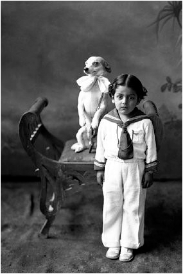 Benjamin vê a cena do retrato burguês como um lugar de sacrifício de si no altar das mercadorias. Que poderia ter pensado diante da vertigem de assimilações que a fotografia de Alejos coloca em jogo? Pois o pequeno cão não apenas disputa com a criança a postura ereta, como ocupa, para todos os efeitos, o “lugar do pai” – dispõe de cadeira, bengala e gravata elegante. O menino não seria mais homem que esse cachorro menos cão. A máquina antropológica – o trânsito entre gente e bicho – tanto distingue o inumano no interior do humano quanto antropomorfiza o animal. O cão, “animal edipiano por excelência”, como nos ensinam Deleuze e Guattari (1977, p. 23) mostra-se aqui em toda a sua desenvoltura: em pé, para horror do cão investigador de Kafka. Pois é do encontro traumático com a trupe de cães dançarinos que decorre a série interminável de perguntas das quais o personagem jamais se libertará: “faziam o mais ridículo e o mais indecente: caminhavam erguidos sobre as patas traseiras” – “Horror! Desnudavam-se e levavam desaforadamente à vista sua nudez”. O protagonista, que nessa época ainda era um jovem cachorrinho, logo se dá conta que diante desse comportamento de seus co-específicos “a própria existência estava em jogo” (KAFKA, s/d, p. 184) As dúvidas que o assaltam, as perguntas cuja resposta busca incansavelmente –sobre a origem dos alimentos e o desejo dos cachorros voadores, por exemplo – acabam por exauri-lo.