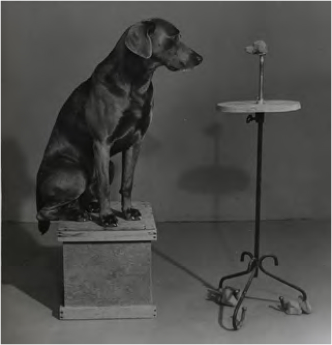 No século XX, a performance de Man Ray como cão-de-pose é, a meu ver, insuperável. Man Ray, nesse caso, é o weimaraner do fotógrafo e videomaker William Wegman. Ao longo dos anos 1970, Man Ray protagonizou diversos vídeos – entre esses, um em que seu amo o ensina a soletrar (WEGMAN, 1972). Mas neles há quase sempre uma anedota que restitui a condição canina ao cão no final da sequência: ou Man Ray lambe afetuosamente o dono após a lição e tem seu erro perdoado; ou somos apresentados à bolinha de tênis que, fora de quadro, comandava os movimentos sincronizados de dois cachorros. Nas fotografias, no entanto, tudo é reduzido à pose. Na rigidez da pose, cada imagem torna-se um comentário e um enigma acerca da relação entre a fotogenia dos cães e a antropogenia da fotografia. Em Contemplando o busto de Man Ray, de 1972, o cão volta-se reflexivamente para uma miniatura de seu próprio busto (Figura 7). Somos lançados em uma espiral cuja descrição é peculiarmente complexa, pois não apenas o duplo encenado antecipa a duplicação fotográfica, como a reflexividade canina, aludindo à reflexividade humana, expõe a íntima interdependência de ambas.