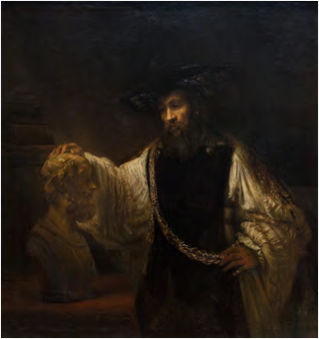 Mas o conjunto de referências e alusões nessa foto não se restringe à cena fotografada. Remetem, como se sabe, à famosa pintura de Rembrandt em que Aristóteles contempla o busto de Homero, de 1653. (Figura 8). O quadro foi pintado por encomenda de um rico patrono italiano quando o pintor holandês, apesar de toda fama, estava oficialmente falido. Por essa razão, sugerem os comentadores, Rembrandt personificou em Aristóteles alguns de seus próprios dilemas. A mão esquerda do filósofo, ornada com um reluzente anel, toca o rico colar que lhe foi presenteado por seu pupilo, o imperador Alexandre; a direita, no entanto, repousa sobre o busto de Homero, que era pobre e cego, mas alcançou a imortalidade. Rembrandt e Aristóteles estariam ambos a se perguntar sobre o destino de suas obras e de seu legado.