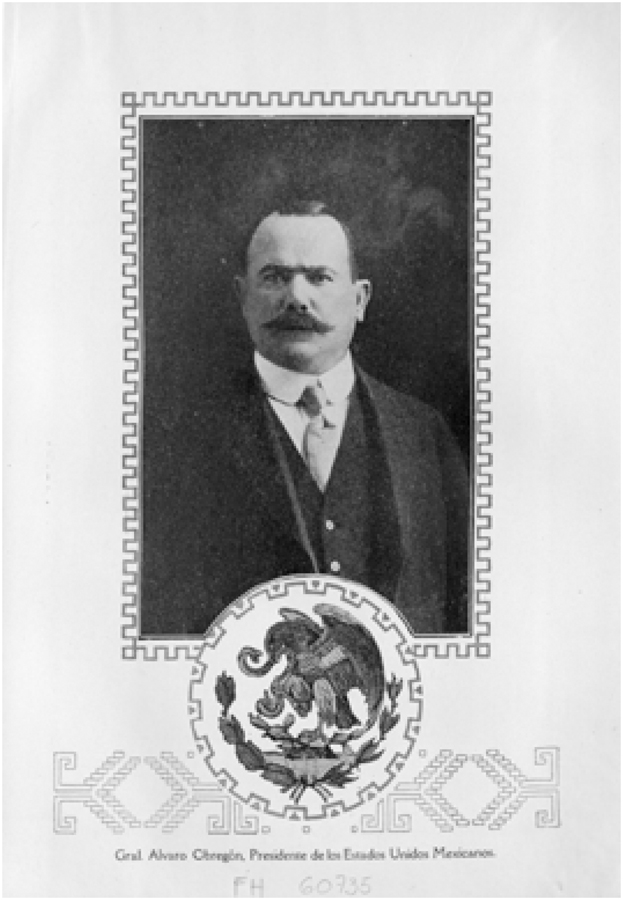 O livro inicia-se com uma fotografia de página inteira do presidente Álvaro Obregón (Imagem 2) ocupando a totalidade da página com uma moldura estilizada que remete a um grafismo pré-hispânico. A fotografia do chefe da nação repousa sobre o escudo nacional mexicano: a imagem de uma águia pousada em um nopal – planta típica mexicana – destroçando, com garras e bico, uma serpente. Símbolo fascinante e ambíguo, representa por um lado a fase pré-hispânica, pois vincula-se à mitologia mexica do lugar mítico da fundação de Tenochtitlán – capital azteca e posteriormente Cidade do México – e a independência, por ter sido escolhida como brasão da república e incorporado à bandeira nacional. Esse escudo carrega em si uma conotação de violência e vínculo com a paisagem local, evocando uma mexicanidade pela alegoria (LÓPEZ AUSTIN, 1995, p. 15).
