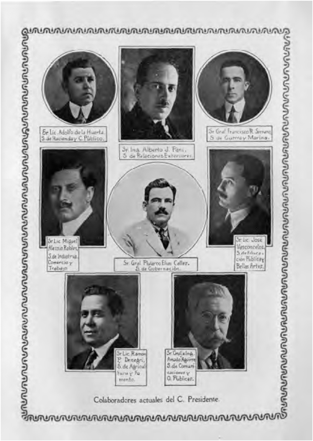 Na página subsequente os leitores se deparam com uma galeria de retratos dos principais ministros (secretários) do governo de Obregón (Imagem 3), tendo ao centro o Secretário de Governo Plutarco Elías Calles14 e ao seu lado direito o Secretário José Vasconcelos. Essa galeria de retratos dá a conhecer o gabinete do governo mexicano. Segue-se o seguinte prólogo: