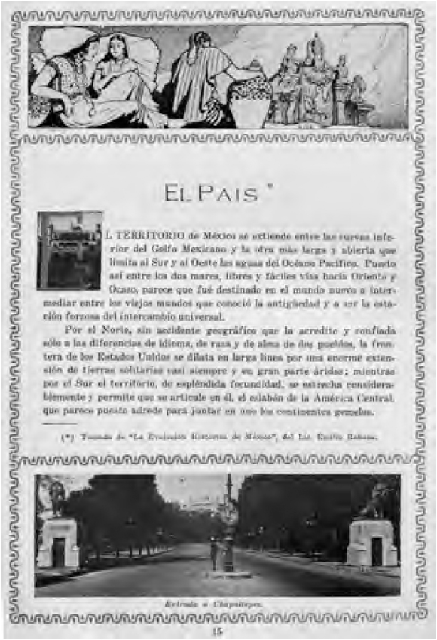 Passo a tratar de alguns capítulos. O intitulado “El País” (Imagem 4) é, contraditoriamente, um extrato do livro La Evolución Histórica de México escrito pelo Licenciado Emilio Rabasa16. Esse autor foi um porfirista e nessa obra defende o legado de Díaz e do liberalismo do porfiriato17. É no mínimo ambíguo que tenham escolhido justamente esse livro recentemente publicado (1920) para abrir essa publicação. Afinal, como afirma Charles Hale (HALE, 2012, p. 255), o autor, apesar de ter exercido enorme influência na constituição de 1917, era um homem antirrevolucionário do ponto de vista político e conservador no social. Posicionou-se contra Madero em 1912, trabalhou como diplomata para Victoniano Huerta18 e foi próximo dos chamados científicos. Em suas obras assumiu uma postura de apologia a Porfirio Díaz, ao porfiriato e ao liberalismo. Nesse capítulo seguem-se várias fotografias de pontos mais característicos da capital e do país. Na parte inferior da página (Imagem 4) vemos uma fotografia tomada a partir da atual Avenida Chapultepec em direção ao Parque e Castelo de Chapultece, um dos locais mais simbólicos do México. Foi residência dos presidentes e imperadores e local da resistência do exército mexicano contra os norte-americanos em 1848.