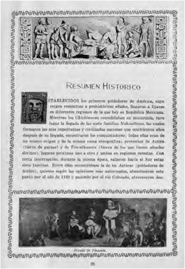 No capítulo intitulado “Resumen Histórico” as imagens são reproduções de pinturas históricas. Abre a seção um desenho da tortura de Cuauthémoch e Tetlepanquetzaltzin. Esse tema é recorrente na pintura histórica mexicana. Podemos citar a obra de Leandro Izaguirre “El Suplicio de Cuauthémoc” (1893) ou posteriormente a obra de David Alfaro Siqueiros “Tormento de Cuauthémoc” (1951), exibida no Palácio de Bellas Artes. O desenho é a reprodução de um relevo de autor desconhecido. Seguem-se reproduções de pintura como a de Rodrigo Gutierrez (1848-1903) com a tela “El Senado de Tlaxcala” (1875). Encerra esse item com a reprodução do óleo sobre tela do pintor Natal Pesado “El general Bravo perdona a la vida a 300 españoles”.19