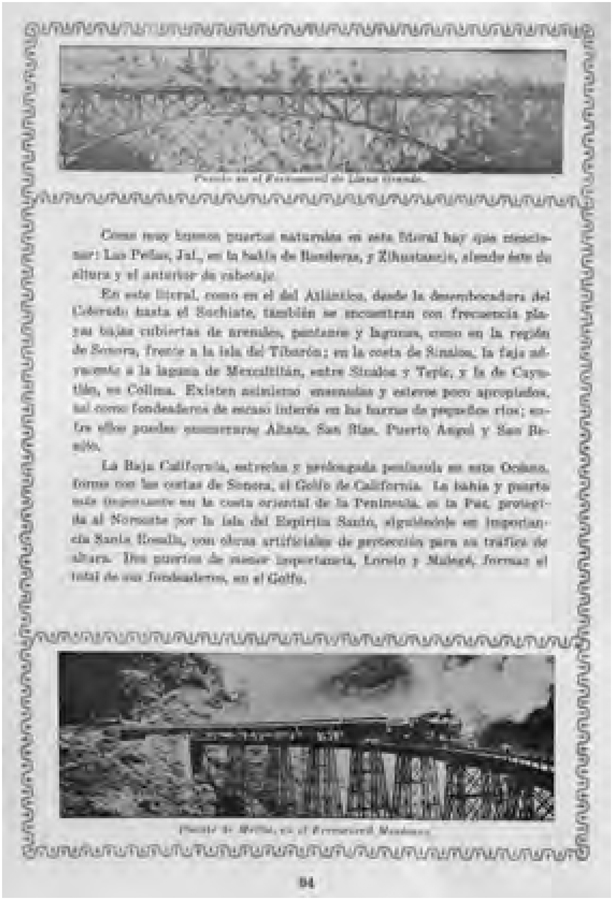 Ainda ressaltam-se (Imagens 6 e 7) as pontes que interligam e superam obstáculos, como rios ou grandes escarpas nas serras. Na Imagem 6, na fotografia da parte de baixo, chama a atenção o trem sobre a Ponte Metlac do Ferrocaril Mexicano. Pode-se divisar em primeiro plano toda a estrutura de ferro e o trem, e em segundo plano a floresta. Tanto passageiros como os maquinistas estão sobre a ponte e posam para o fotógrafo.