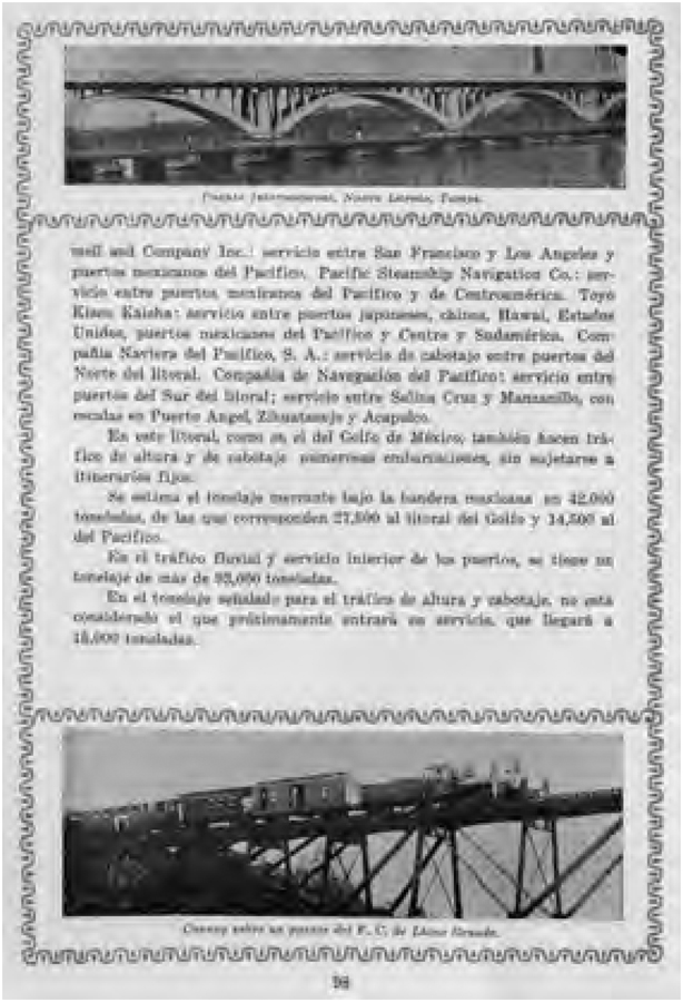 No padrão temático visual Educação e Cultura merecem menção os capítulos dedicados à educação, museus e cultura em geral. São fotografias de teatros, bibliotecas, monumentos, somados às imagens de ruínas pré-hispânicas e edifícios religiosos – em sua maioria igrejas católicas. A natureza, outro elemento importante na construção da identidade mexicana, está presente com estampas de vulcões, lagos, serras e rios22. As representações da natureza possuem todo um vocabulário iconográfico de uma consciência territorial e de uma identidade nacional, uma tomada de consciência, tanto poética, como de sensibilidade, que se converte em meio de expressão. Essas imagens elaboram uma narrativa apresentando o México como um país civilizado, com um passado rico, mas que se encontra entre as nações ocidentais, pois é educado e católico. A publicação ainda apresenta as principais cidades, em geral no formato de panorâmicas, assim como destaca as grandes avenidas, praças, ruas comerciais e dos edifícios mais emblemáticos.