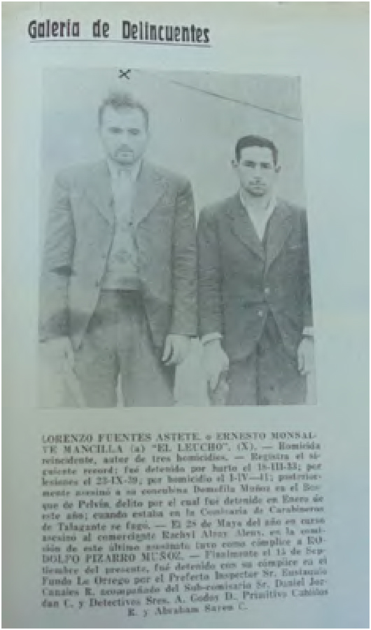 ¿Quiénes escribieron en sus páginas? Detectives, jefes de servicio (como fue el caso de René Vergara, creador y líder de la Brigada de Homicidios), médicos, abogados y escritores, en particular en los artículos de opinión o en la selección de algunos pasajes de literatura policial (más extranjera que nacional). ¿Estas publicaciones dialogaron con otros medios del período? En algunas de las editoriales, y en notas muy precisas, se hace referencia a un contexto general de aumento de la delincuencia y la criminalidad, lo que es expuesto a través de la opinión de autoridades, en las cuales se mencionan otros diarios y revistas de época. Sin embargo, ello no siempre abunda. En todo caso, creemos que para entregar un contexto de significación a las galerías de delincuentes, elemento por lo demás de continuidad en estas tres revistas, es preciso también considerar que estas publicaciones, sus características y mensajes, se insertaban dentro de una industria cultural (SANTA CRUZ Y SANTA CRUZ, 2005) que, para nuestro período en estudio, había ido igualmente incorporando y definiendo al delito y a sus víctimas como un producto de consumo. Junto a nuestras revistas, existían otras similares, aunque de corte más académico: Ciencias Penales, Revista Chilena de Ciencia Penitenciaria y de Derecho Penal, las cuales, bajo el amparo de la Dirección General de Prisiones (que contaba además con un Boletín), desde mediados de los años 30 en adelante consideraron como su temática central el estudio del mundo del delito y el crimen. Otras publicaciones de corte misceláneo y magazinesco: Intimidades y sucesos policiales, Manos Arriba, como asimismo la prensa surgida durante estos años: Clarín, Las Noticias Gráficas, La Tercera de la Hora, integraron igualmente esta temática a sus contenidos.