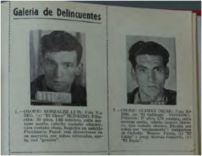 Abundaban todavía los artículos relativos a las ideas de Cesare Lombroso y los matices incorporados por sus discípulos (Enrico Ferri y Rafael Garófalo) a la antropología criminal (HONORATO, 1960; LAGARRIGUE, 1944; PALMA, 1943; VARGAS, 1947). En términos generales, se planteaba a través de dichos escritos que el delincuente-criminal era fácil de reconocer por su apariencia: desastrado, sucio, y por sus gestos: mirada extraviada, muecas de desagrado y perversión; a lo que se unía el tema de los apodos (importante para su reconocimiento) y su lenguaje: el coa (NÚÑEZ, 1960; V.Z.S, 1956). Vale decir, aún perduraban, como lo indicó Goffman (2012) para el mundo anglosajón, los estigmas de la apariencia que la identificación criminal, a través descripciones y fotografías, hacía visibles a través de la exposición de las fisonomías y deformidades.