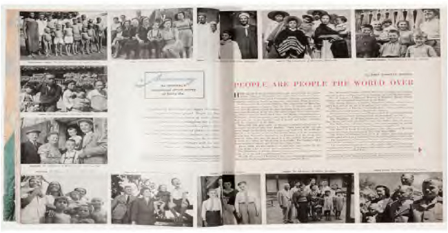 Também a experiência da Segunda Guerra Mundial pode ser vista como um ponto de convergência. Apesar da pouca idade, Andujar foi testemunha ao mesmo tempo que vítima do conflito, assim como a grande maioria dos fotógrafos envolvidos no ambicioso projeto de 1948, e o próprio Morris. Eles conheceram em primeira mão a destruição, a escassez e o trauma que permaneceram após o armistício. Alguns aspectos de People are people the world over parecem querer dar a conhecer esta realidade para os norte-americanos que não a experienciaram. Por outro lado, a mensagem que a reportagem declarou querer passar para os seus leitores, de fraternidade e união, estava em perfeita sintonia com a cultura política do pós-guerra que estava sendo trabalhada pelos EUA, voltada para um ideário político não apenas de reconstrução, mas também de reconciliação de certos países e povos que faria um papel importante durante a Guerra Fria e os processos de neocolonialismo, como será tratado mais adiante11. Fotograficamente, como se verá, esta cultura política se assentaria na centralidade da família burguesa e na noção de fotografia como uma linguagem universal. Sendo assim, People are people the world over estaria localizada em um momento inicial da vertente fotográfica do humanismo, que viveu seu auge durante a década de 1950 e 1960. Na outra ponta estaria a série das famílias brasileiras.