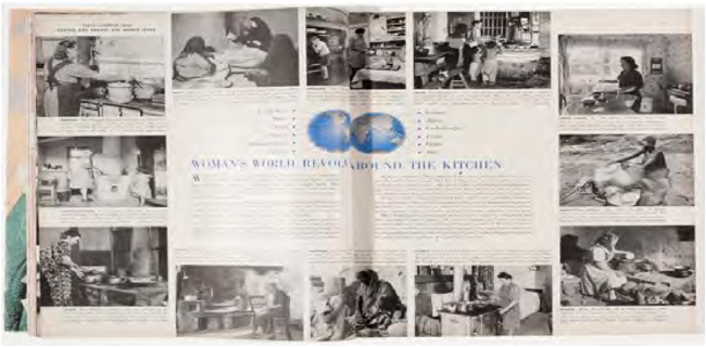 Na página seguinte, esta edição da revista já traz a primeira reportagem, dedicada à cozinha, sua estrutura e utensílios e, ao tratar destes assuntos, se foca nas mulheres e nas crianças. Seu título é “O mundo da mulher gira em torno da cozinha”. As doze fotografias mostram cada uma das mães das famílias, algumas com os filhos, em suas cozinhas, as quais têm as mais variadas conformações. Entre outras coisas, o texto da reportagem salienta a escassez de leite para as crianças paquistanesas, e a abundância para as inglesas; relata que a mãe alemã é visitada por pessoas famintas da cidade, e que continua a tradição iniciada durante a guerra de dar uma batata a cada um; afirma que cinco das cozinhas têm chão de terra, e no Paquistão e na África Equatorial a maior parte da comida é feita ao ar livre; diz também que a mãe chinesa nunca teve contato com um enlatado ou uma garrafa. Além deste texto geral, há uma legenda para cada imagem. A legenda relativa à família norte-americana afirma que esta é a única com geladeira elétrica, e que ela tem fogão a gás e água encanada, mas que a mãe quer ainda assim reformar sua cozinha (Ladies’ Home Journal, v. LXV, n. 5, maio de 1948) (Imagem 6).