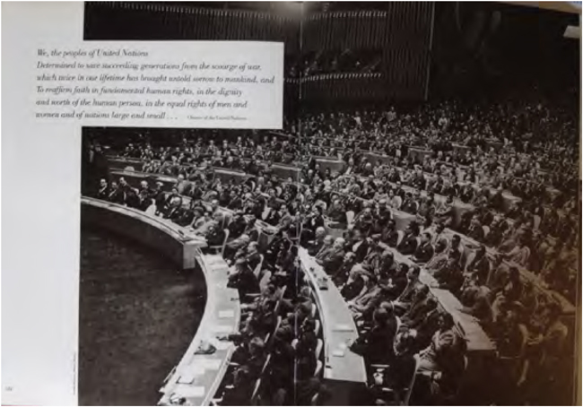 Esta mesma ideia esteve presente nas paredes da própria exposição, onde eram visíveis pequenas citações de textos culturalmente significativos de varias regiões, como trechos da Bíblia, de Lao-Tsé, do Bagavad-Gita, de frases de índios norte-americanos, e de vários autores da literatura mundial. Um dos trechos reproduzidos é da Carta das Nações Unidas, relacionando claramente as fotografias expostas à cultura política de unificação e reconstrução16. A fotografia que acompanha este trecho, uma das últimas imagens da exposição, e do catálogo, mostra a Assembléia Geral na sede da ONU em Nova York totalmente ocupada pelos delegados e representantes dos países membros (Imagem 8).