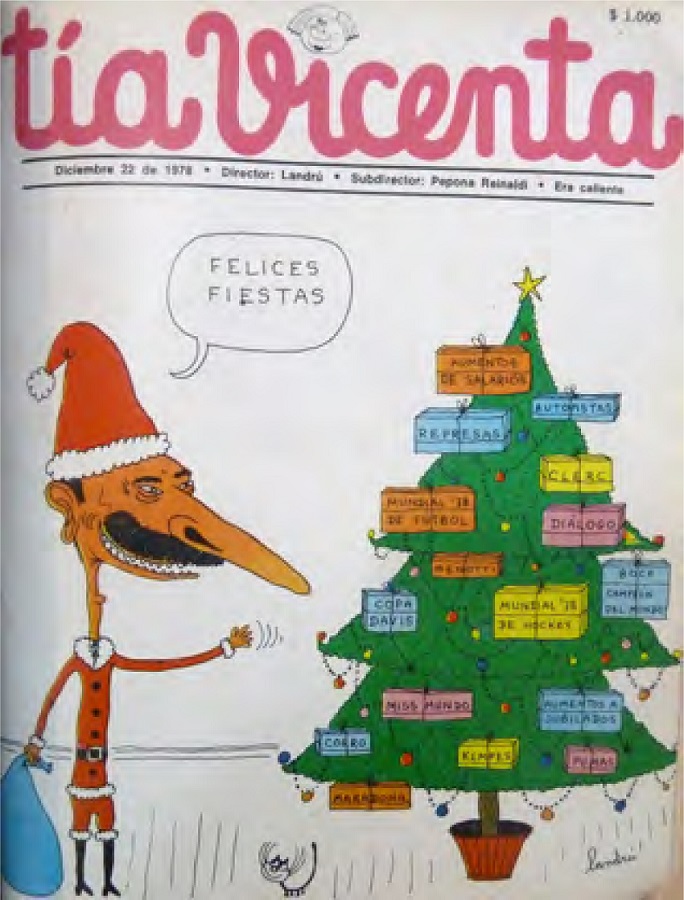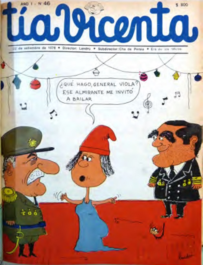 Es en este contexto en donde Landrú decide retomar la publicación de Tía Vicenta, luego de casi 10 años sin dirigir una revista de humor y sátira política10. ¿Por qué el ya veterano caricaturista, que contaba con un puesto sumamente cómodo en Clarín y Gente, decidió volver a la edición de una revista que ya había sido víctima de la censura, en un contexto dictatorial aún más severo?