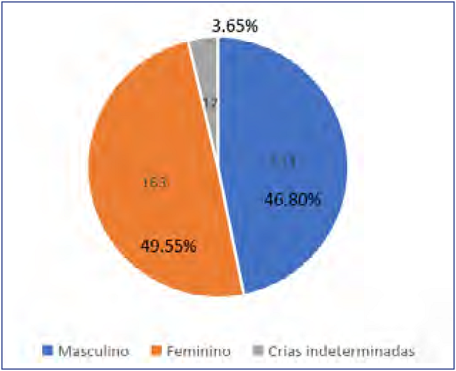 Por meio dessas informações, sabe-se que em 1743, a fazenda de São Cristóvão possuía 250 escravos (ARSI, Bras. 6/II). Este número significava 10,70% do total (2.337) que os jesuítas possuíam na capitania. Quatorze anos depois, o reitor Joannes Honorato demonstrava que eram 2.616 cativos na capitania e que a fazenda de São Cristóvão contava com 235 escravos, representando 9,0% do total da escravaria pertencente à ordem na capitania (ARSI, Bras. 6/II). Os dados fornecidos pelo desembargador Afonseca Brandão indicam que no ano de 1759 a fazenda estava com uma população escrava de 329 pessoas (ANTT, Autos de inventários, 1759). Como o total de mão de obra cativa dos jesuítas na capitania era de 2.506, o grupo de São Cristóvão significava 13,13% de sua escravaria total. Analisando apenas os 329 listados em 1759, pode-se perceber, pelo gráfico abaixo (Gráfico 1), que estavam distribuídos segundo os sexos da seguinte maneira.